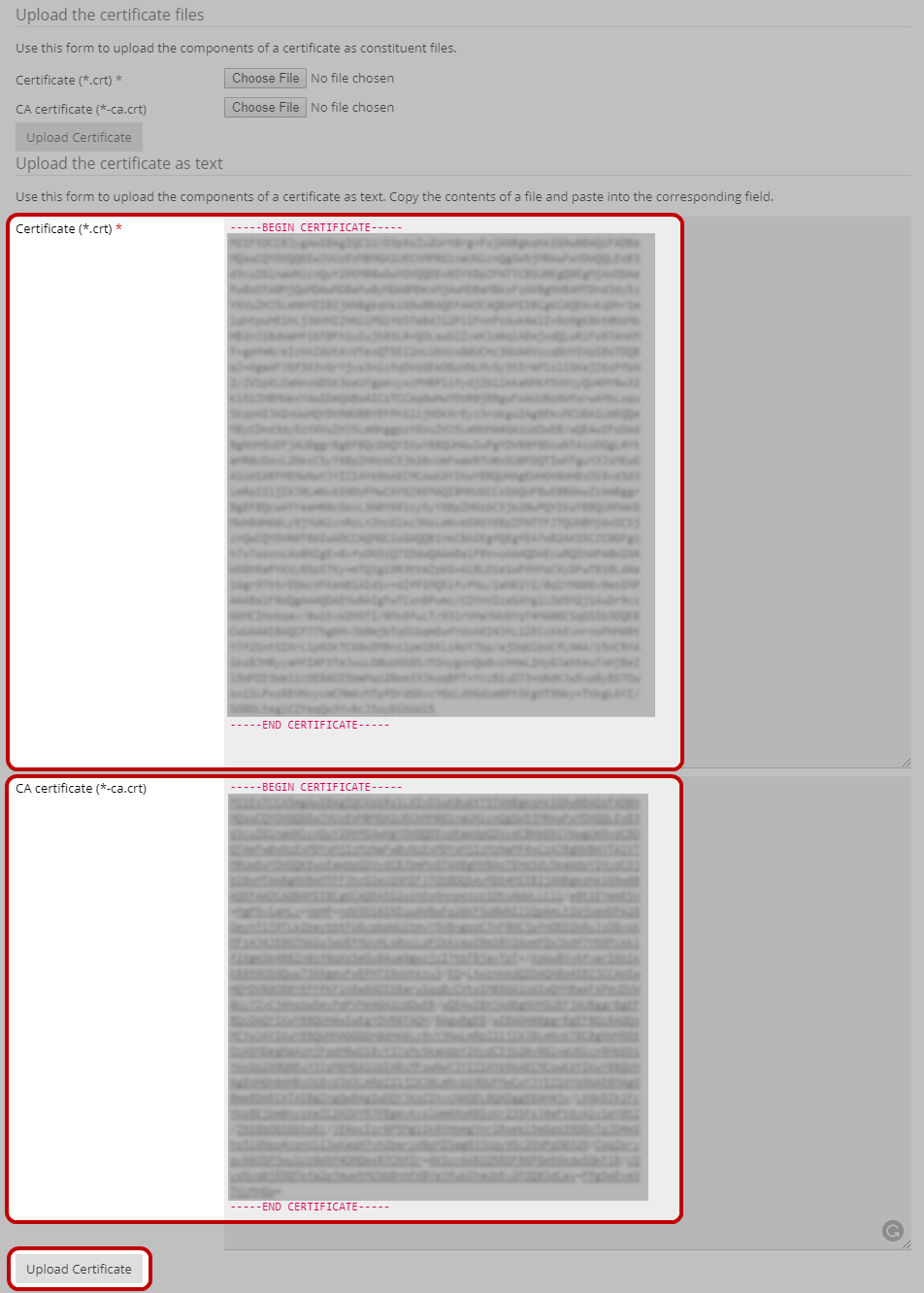 - Use either the Upload the certificate files option to upload your certificate files or Upload the certificate as text option to paste your certificate information. Be sure to include both the Certificate as well as CA Certificate as supplied to you. Your website cannot be secured without both pieces of data